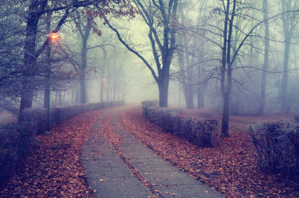 Walkway through the park on misty autumn day.